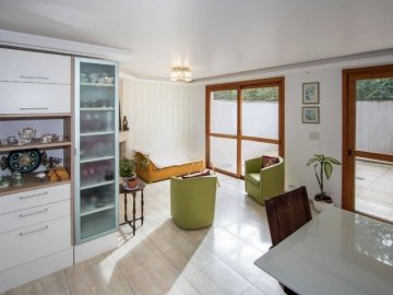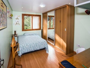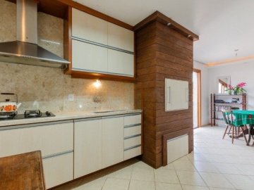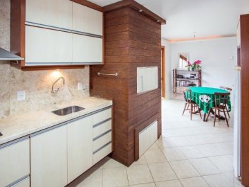 Térreo - hall de entrada, lavabo, amplo living com 3 ambientes, lareira e churrasqueira, pátio integrado ao estar, cozinha montada, lavanderia, dependência de empregada, banheiro auxiliar e garagem coberta para 2 carros.